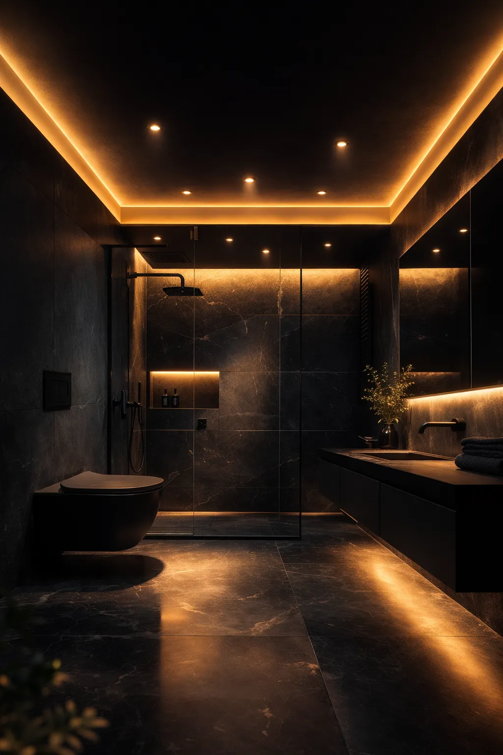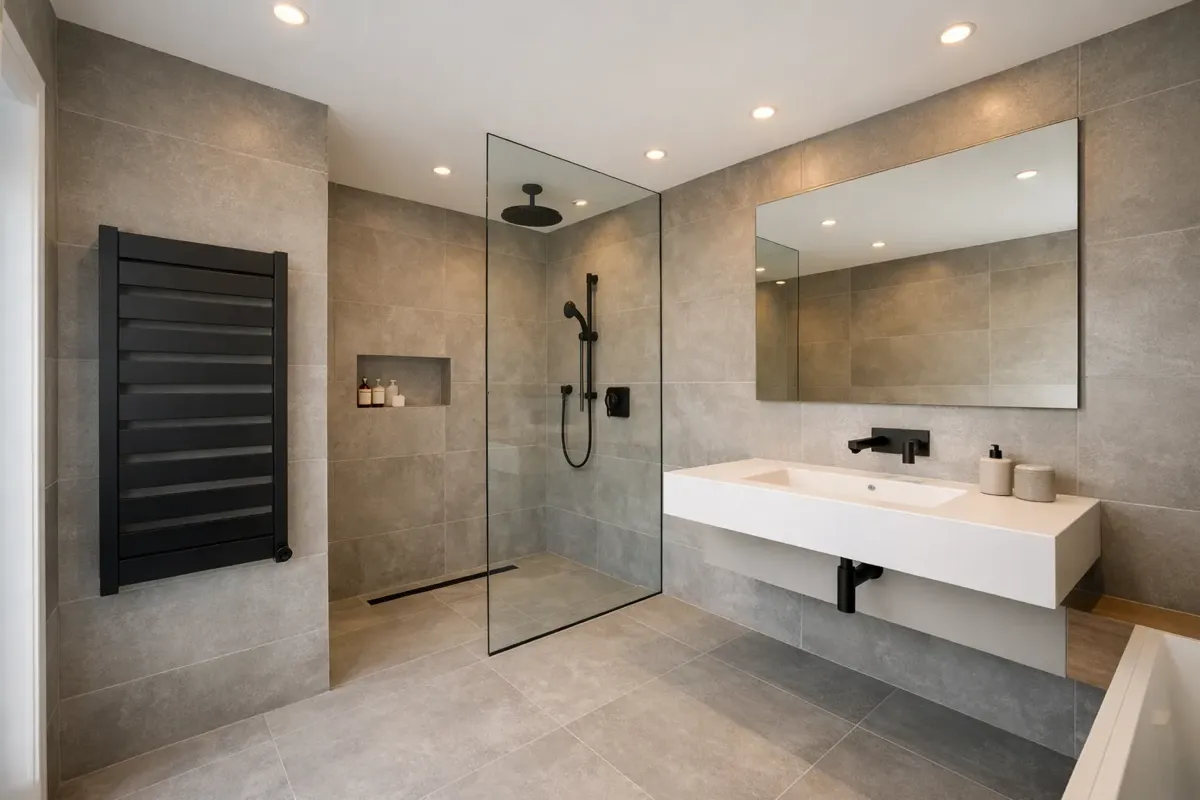 Veraltetes Badezimmer komplett saniert. Bodengleiche Dusche mit Glasabtrennung, Großformat-Fliesen in Marmoroptik, moderner Designheizkörper und neue Sanitärtechnik. Alle Gewerke koordiniert — termingerecht und zum Festpreis.